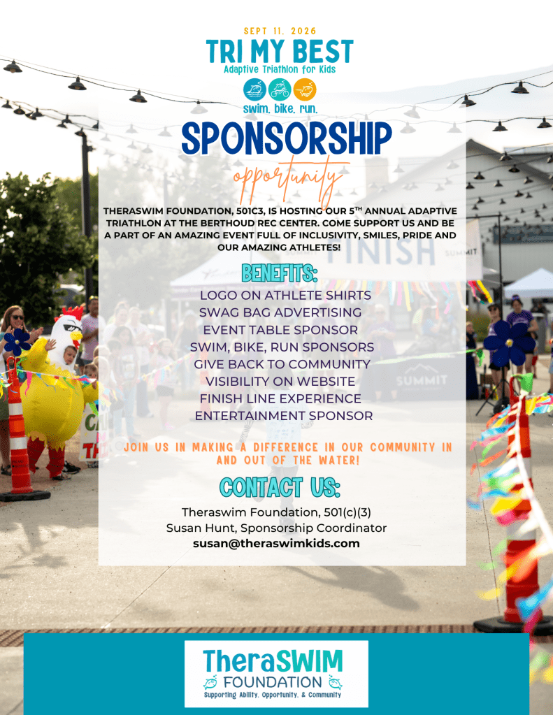 Please review the attached sponsorship packet below for more details. I’d be happy to discuss these opportunities further and tailor a package that aligns with your business goals. If you’re interested or have any questions, please contact me at 970-400-9914 or susan@theraswimkids.com.